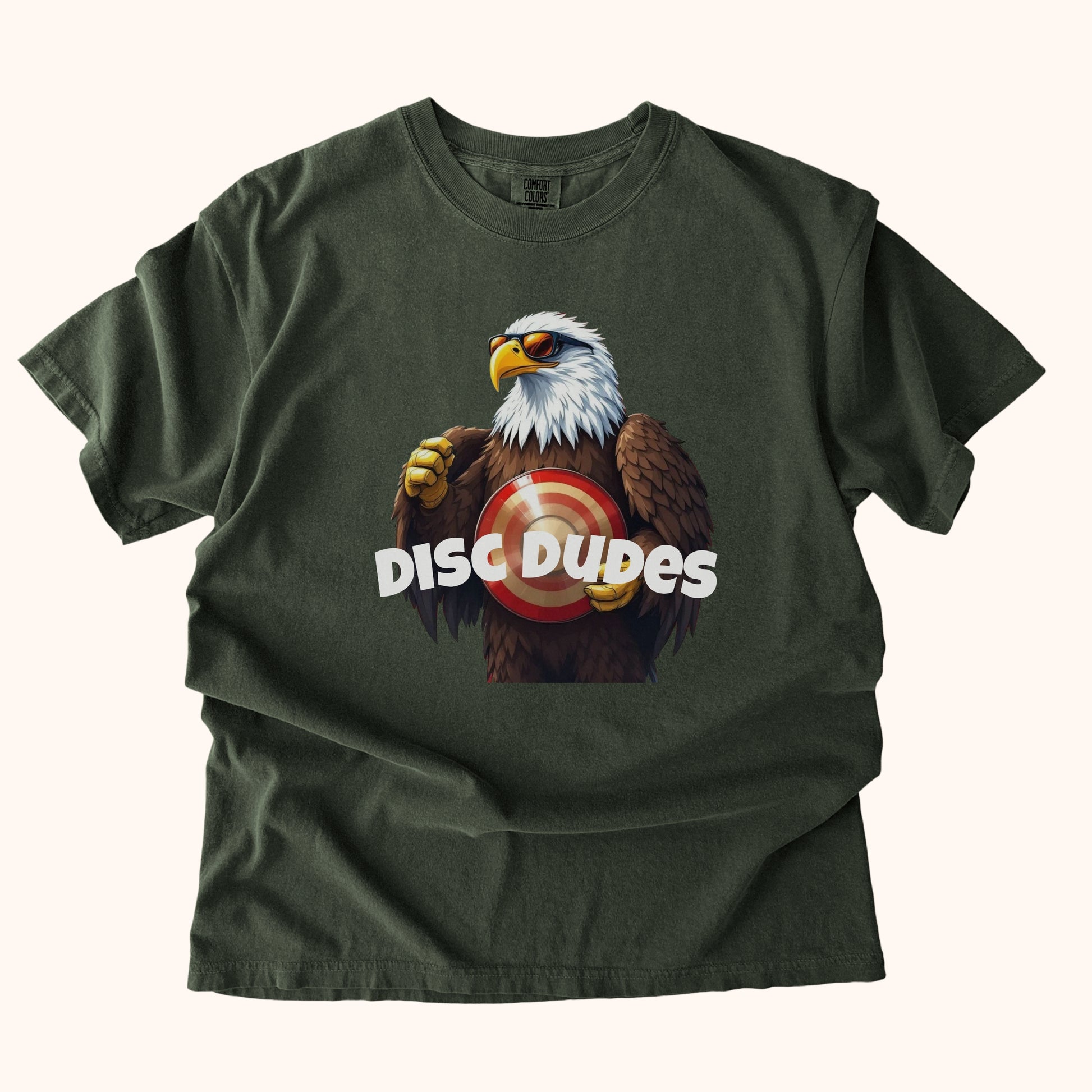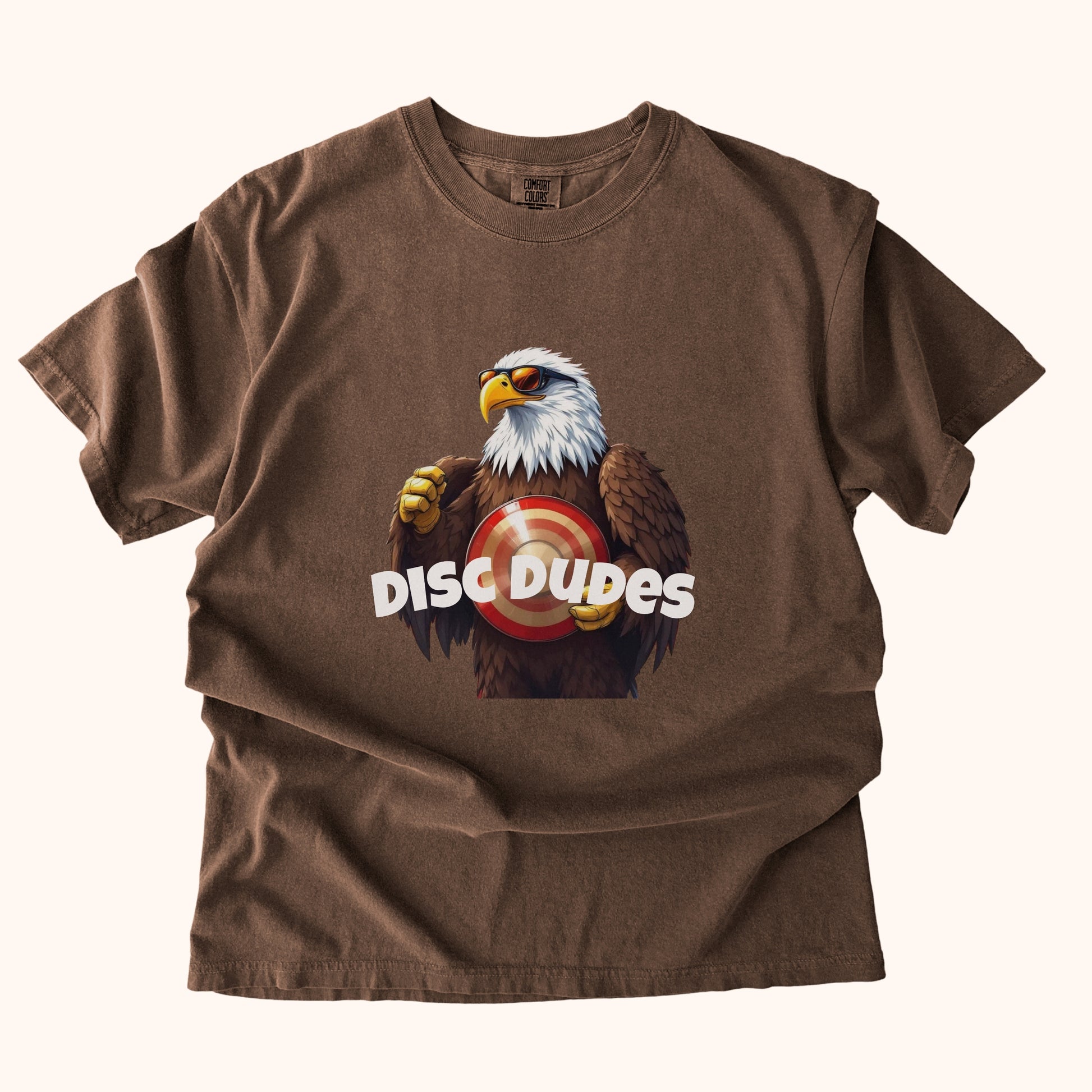 The Disc Dudes “Eagle Grip” tee features a bold, battle-ready eagle locking onto a disc like it’s about to launch a perfect drive. With rich espresso tones and a standout graphic, this one hits that perfect mix of rugged, vintage, and straight-up badass.