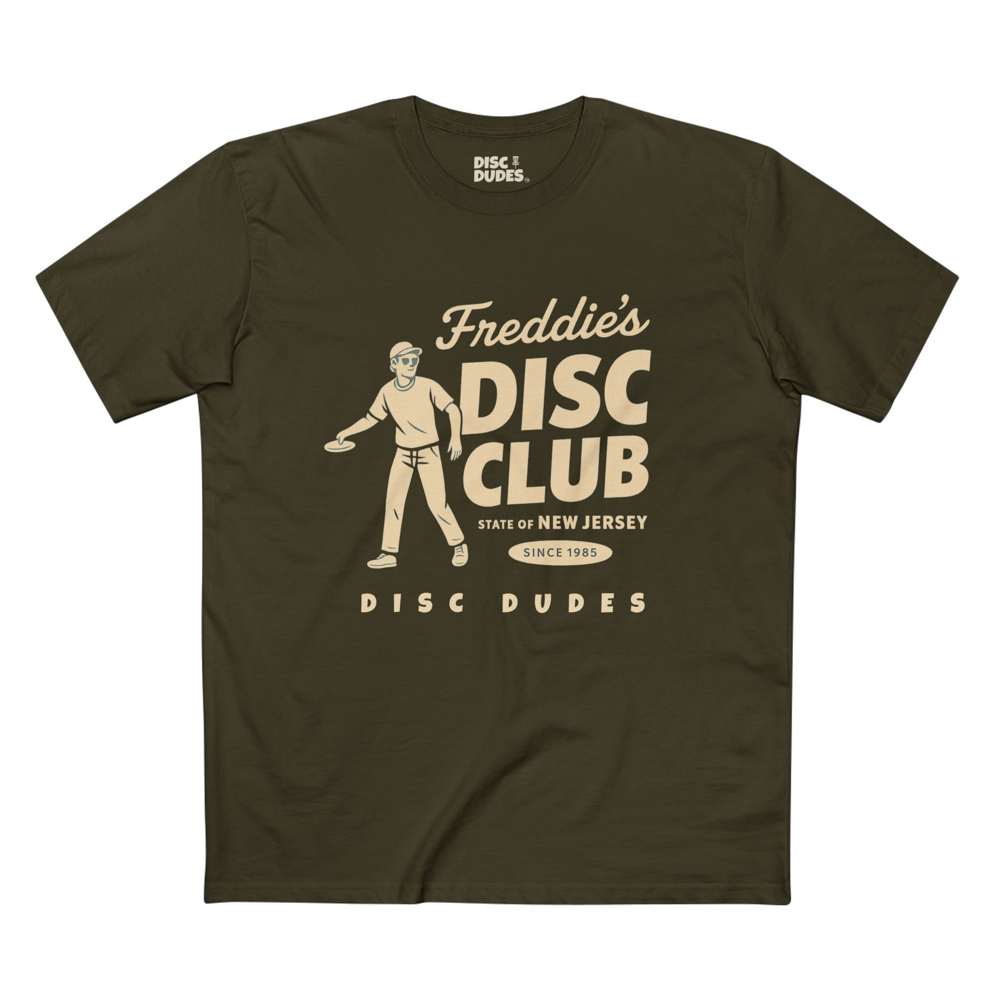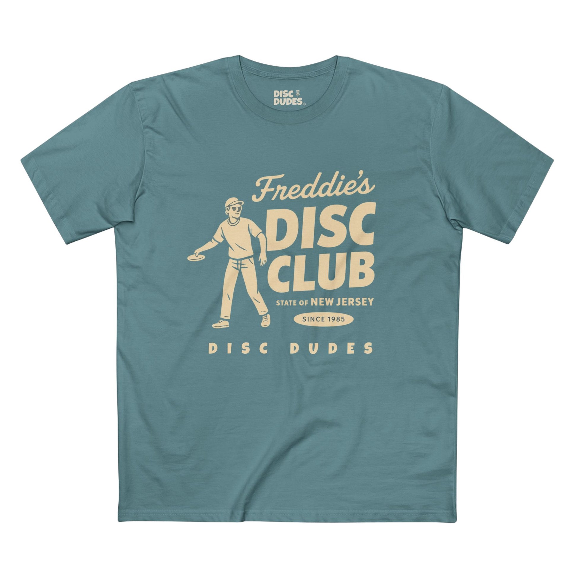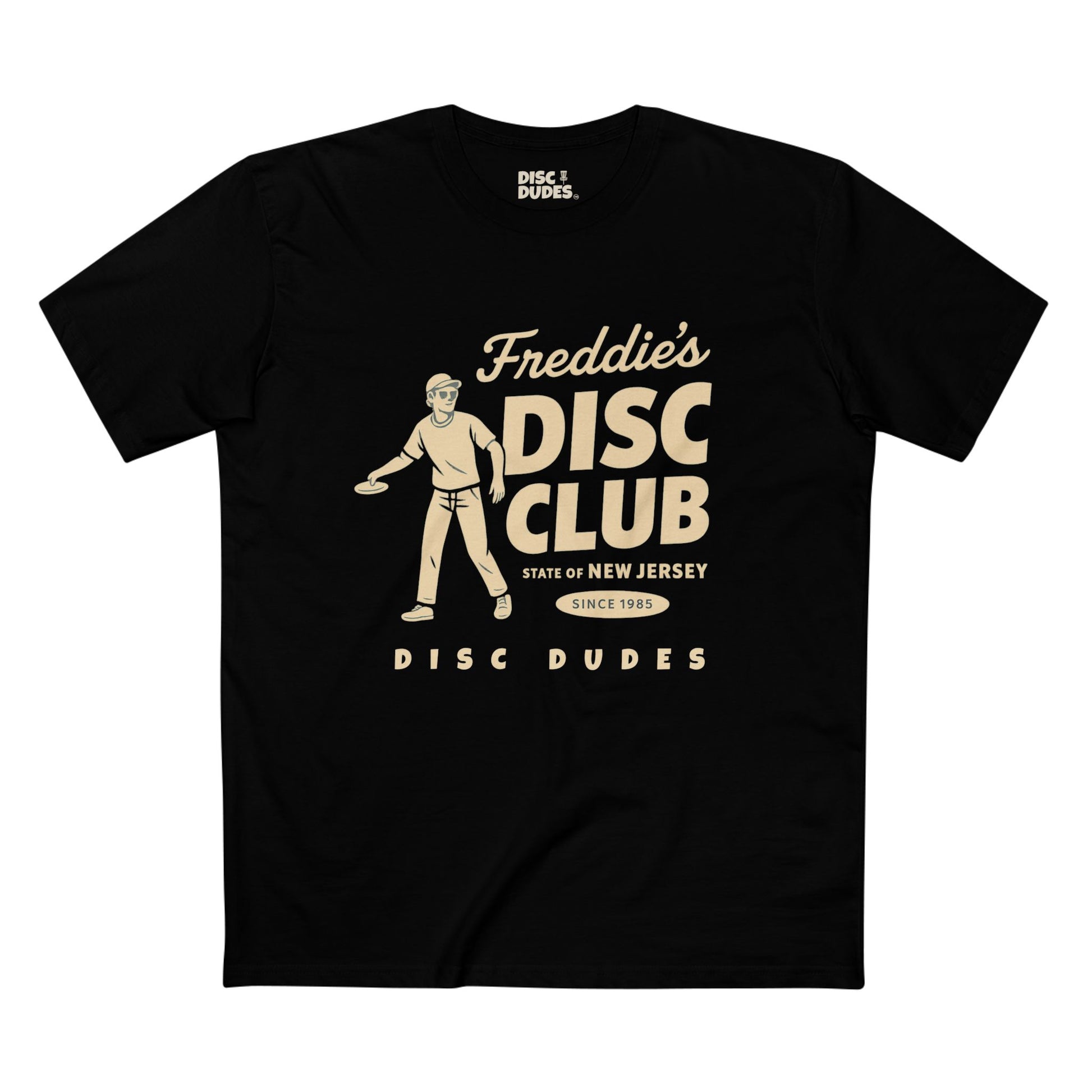 Inspired by classic golf graphics with a Disc Dudes twist — Freddie’s isn’t real, but the vibe is.